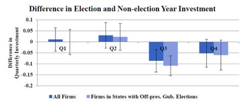 In a study of U.S. firm capital expenditure investments from 1984 to 2008, Assistant Professor of Finance Candace Jens finds that firms reduce their capital expenditures by an average of 5 percent prior to gubernatorial elections in their home states. If a race is close, those investments can drop by as much as 15 percent. Based on the 8,200 firms in her sample, that amounts to nearly $108 billion in deferred investments.